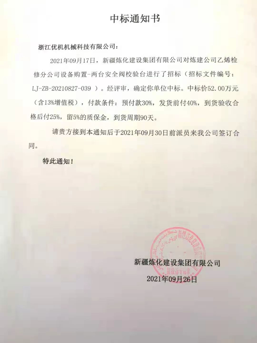 近期,新疆煉化建設集團有限公司發出中標通知書,宣布通知浙江優機機械科技有限公司,二次添加設備購置項目-兩套安全閥校驗臺,經評審確定中標(招標文件編號:LJ-ZB-20210827-039),合計一期和二期閥門檢測校驗設備總數達到11臺(套)金額貳佰多萬,該項目是浙江優機機械科技有限公司主營產品進入中石油樣本項目。